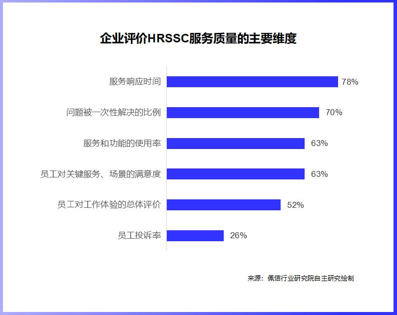 3.关于HRSSC服务质量的评价维度,78%的企业关注服务响应时间( 及时性),70%的企业关注问题被一次性解决的比例( 准确性),63%的企业看重HRSSC 服务和功能的使用率,以及员工对关键服务、场景的满意度。