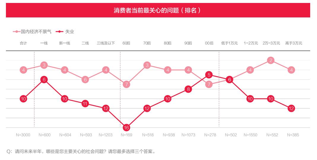 总的来说,这些下沉市场的家电消费者,尤其是60后、拥有超高收入的家庭,有着比一线城市(55)更高的消费信心(66),70后、收入2-3万元的消费者更加关注国际安全和稳定、通货膨胀。