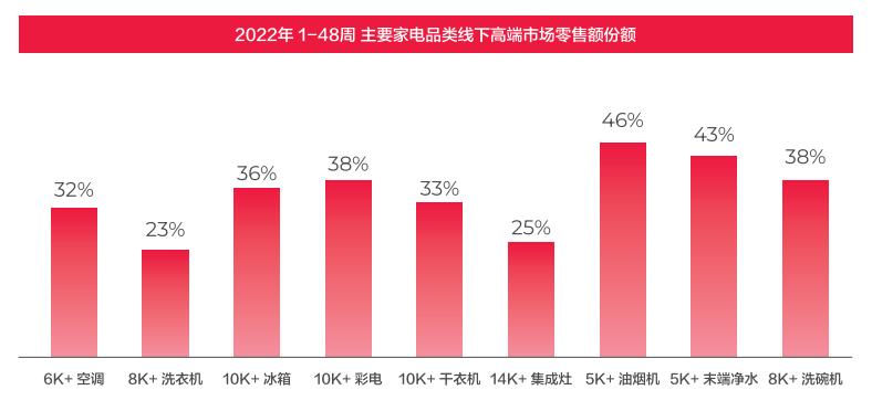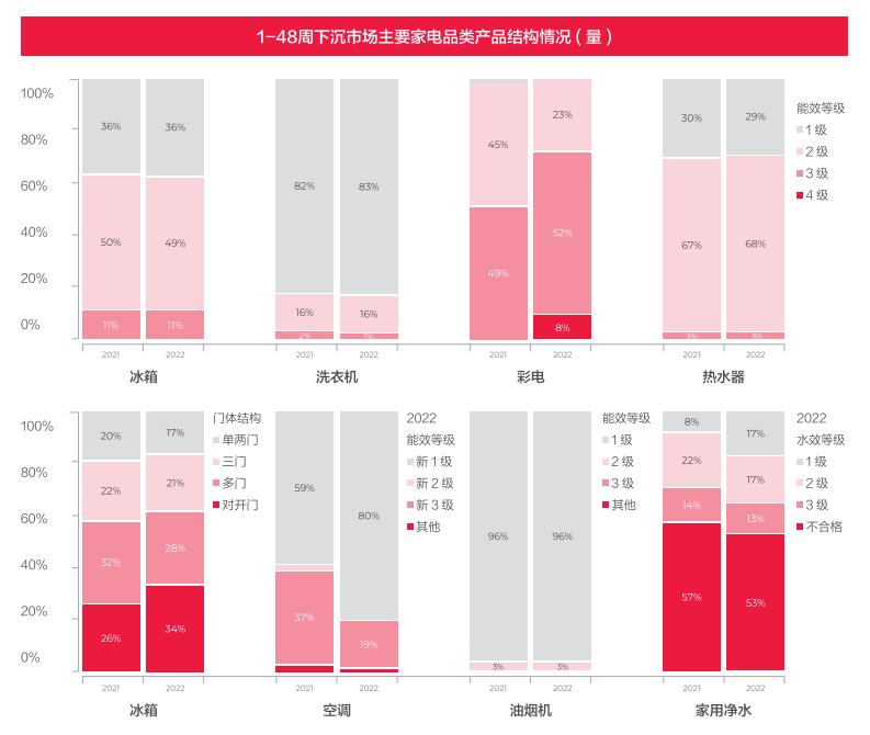 在节能减排的背景下,洗衣机、热水器、空调的一级能效产品成交量都达到了市场整体的80%以上,2021-2022年一级能效产品比例增长最快的品类是空调(59%→80%),一级能效产品比例不升反降、绝对比例最低的品类是彩电。这主要是基于2022年新能效、水效标准落地,提高了空调、家用净水产品的准入门槛。