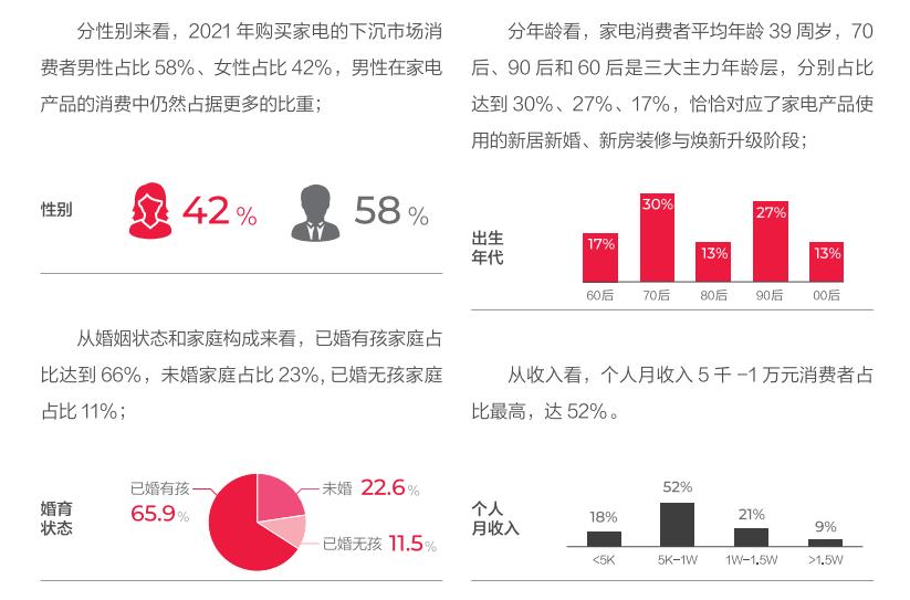 据Gfk中怡康调研,2021年购买家电的下沉市场消费者58%是男性,其中65.9%已婚有孩,52%拥有5k-1w月收入,而且呈现出明显的代际特征,60后(17%)、70后(30%)、90后(27%)是主力消费年龄层,分别对应家电产品使用的新居新婚、新房装修、焕新升级三大阶段。