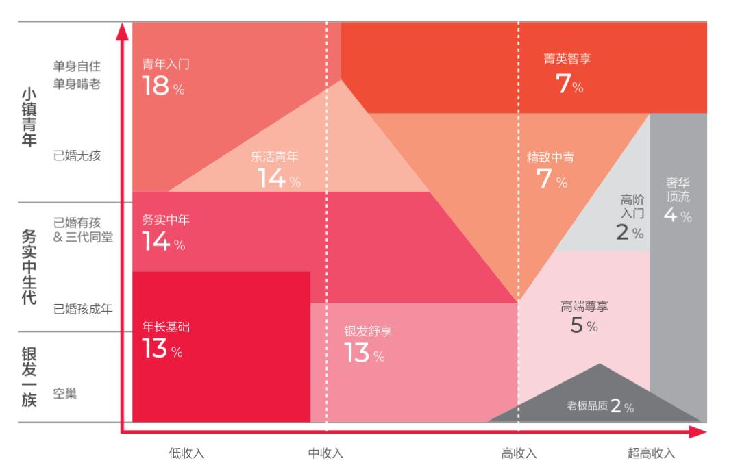 其中,拥有中低收入的单身自住/单身啃老/已婚无孩的小镇青年(18%)、已婚有孩甚至三代同堂/已婚孩成年的务实中生代(14%)、空巢的银发一族(13%)、银发舒享一族(13%)是其中比例最大的五类消费者。