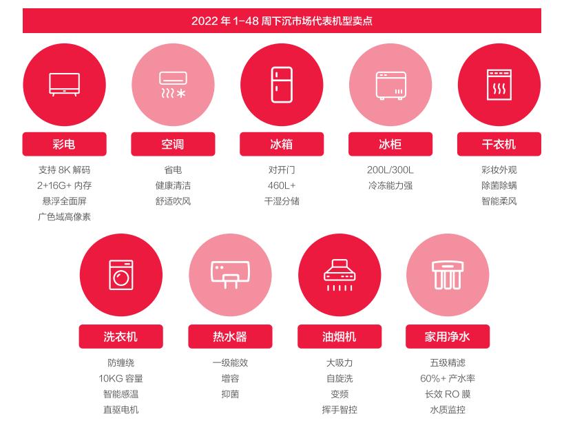 在对2022年1-48周下沉市场家电品类构成情况的统计中,最容易下沉的还是以传统品类为主,包括空调(32.9%)、冰箱(19.1%)、洗衣机(16.1%)、彩电(14.7%)、热水器(8.8%)、油烟机(2.1%)、燃气灶(1.1%)、家用净水(1%)。