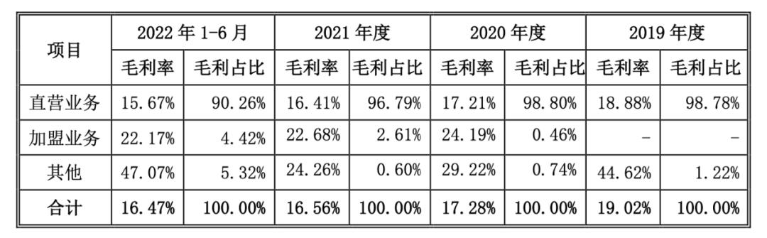 但由于直营业务存在的门店房租物业费、长期待摊费用摊销、固定资产折旧、人工薪酬以等等都会计入营业成本,其毛利率要低于加盟业务毛利率。