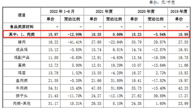 从招股书来看,老乡鸡大部分原材料的单价涨幅并不大,成本占比达43%的的肉类在2020年和2021年的上涨幅度分别为-3.94%和0.66%,2022年上半年,肉类、生鲜蔬菜、米面干货以及调味品单价均有不同程度的下跌。