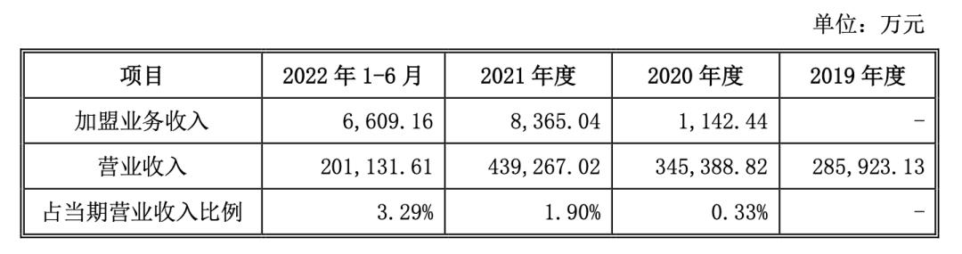 也是从2020年,老乡鸡开始试水加盟业务。老乡鸡招股书数据显示,2019年至2022年1-6月,加盟门店总量分别为0、13、82、102家。2020年、2021年和2022年1-6月,加盟业务收入占公司营业收入的比重分别为0.33%、1.90%和3.29%。
