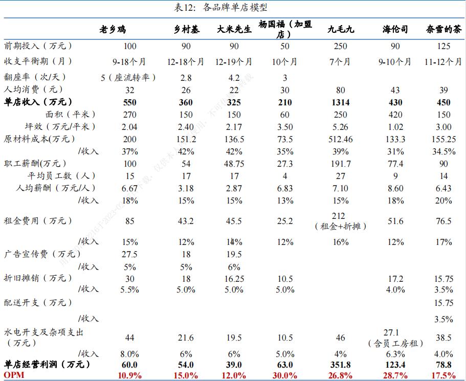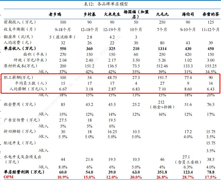 此外,老乡鸡的单店收入为550万元,乡村基、大米先生和杨国福则分别为360万元、325万元和210万元,翻桌率方面,老乡鸡、乡村基、大米先生和杨国福分别为5、2.8、4.2和3。