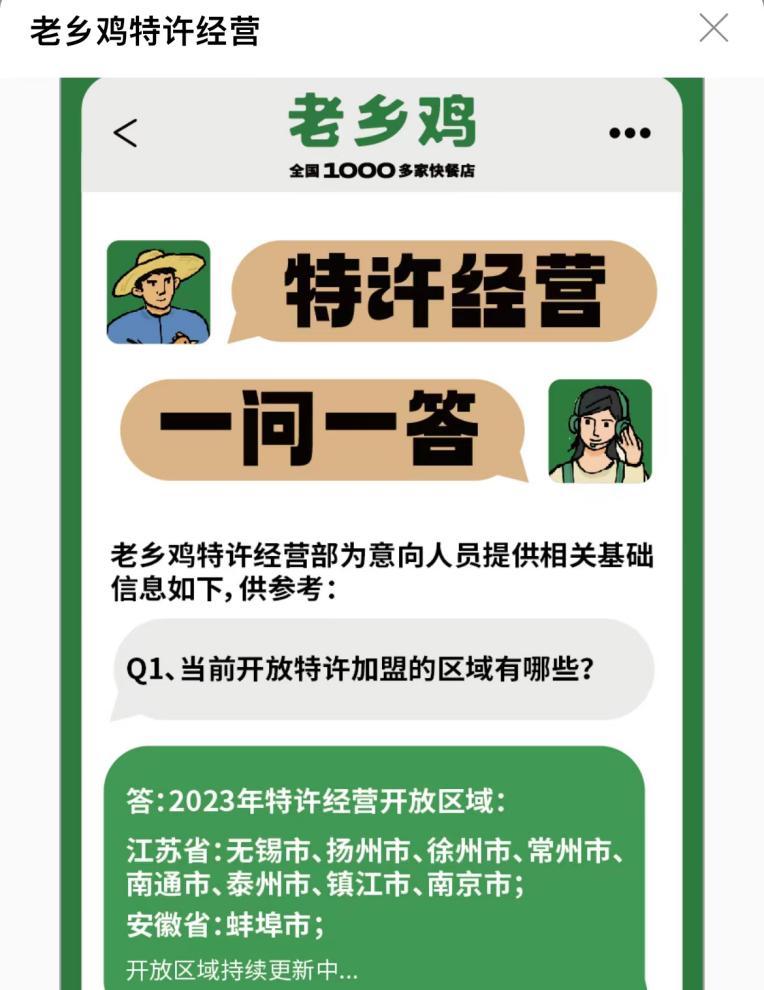 虽然老乡鸡开放了加盟,但相对克制。通过老乡鸡官网“特许经营一问一答”可以看到,其开放加盟的地区也主要集中在华东。