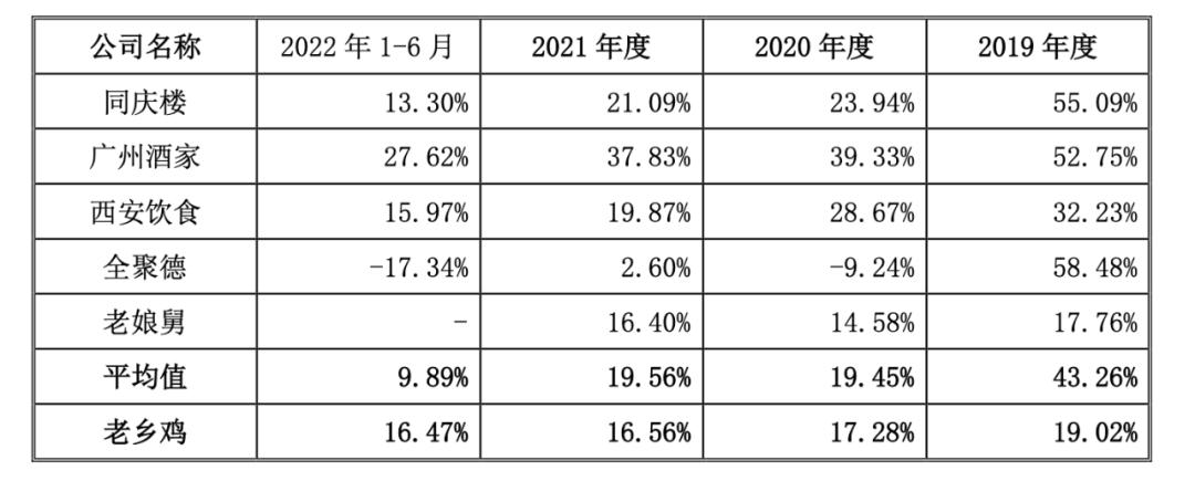 与同庆楼、广州酒家、西安饮食、全聚德四家同行业A股上市公司相比,2019-2021年间老乡鸡的毛利率低于上述上市公司综合毛利率的平均值。一同冲刺“中式快餐第一股”的老娘舅,也是如此。