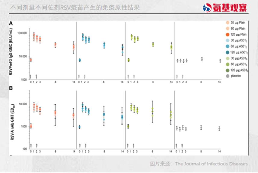 结果显示,与无佐剂相比,任何佐剂的存在显著增加了体液免疫和细胞免疫。其中,使用AS01b佐剂RSV疫苗的免疫原性,比使用AS01e的免疫原性更高。不过,鉴于AS01e出现的不良反应更低,最终葛兰素史克在RSV疫苗中选择了AS01e这一佐剂。