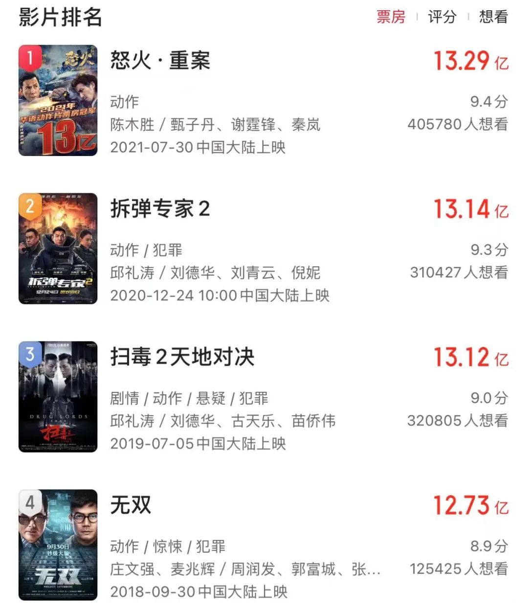 从内地港片票房榜中可以看出,目前位列票房前三的《怒火·重案》《拆弹专家2》《扫毒2天地对决》无一例外都有过硬口碑基础。毫无疑问,好口碑仍是项目大卖的核心要素。