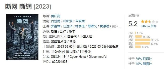头部港片主创班底、独占档期红利、映前点映口碑9.2,本让《断网》这部身处冷档期的新港片,获得了超出预期的开局表现。然而在上映仅两天时间后,该片的口碑和票房便纷纷出现跳水,暴露了影片市场走势不佳的现状。