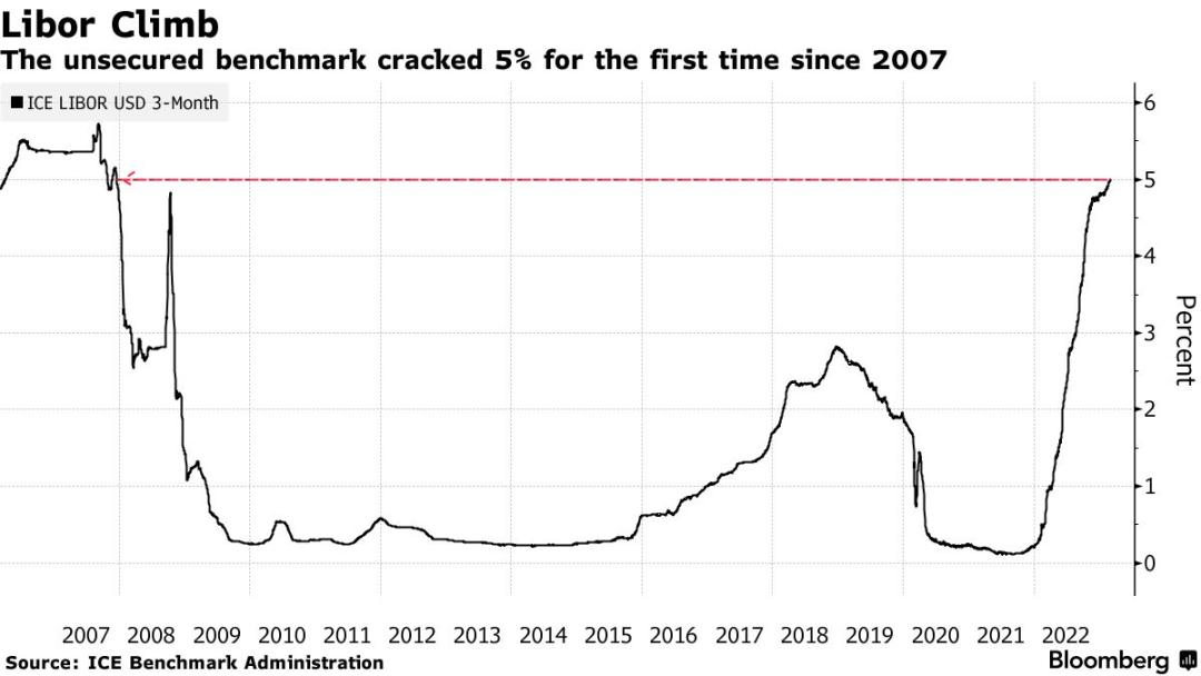 从上图可以看出,3个月期美元Libor自2022年开始便一路上行。今年1月中旬,3个月期美元Libor已经回升到了2008年全球金融危机爆发前的水平。