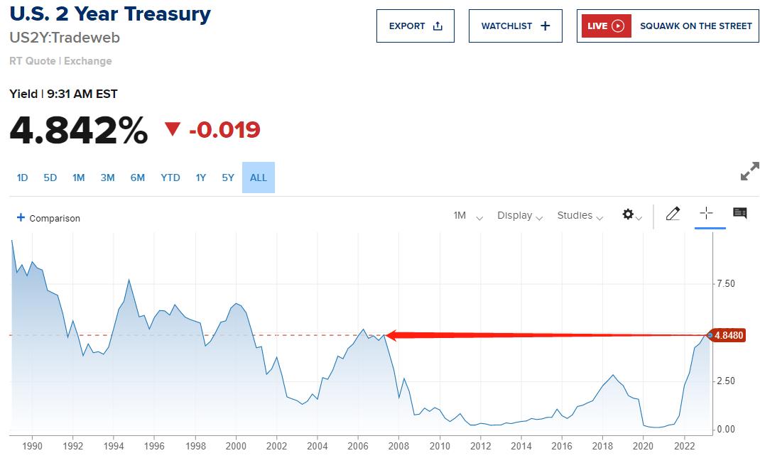 除了3个月期美元Libor外,近期还有两项关键的指标也都创下了2007年以来的新高——今年,2月初以来,美债遭遇了大规模的抛售潮,目前,1年期美债收益率已经突破5%,2年期美债收益率也上破4.85%,均创下2007年以来最高。