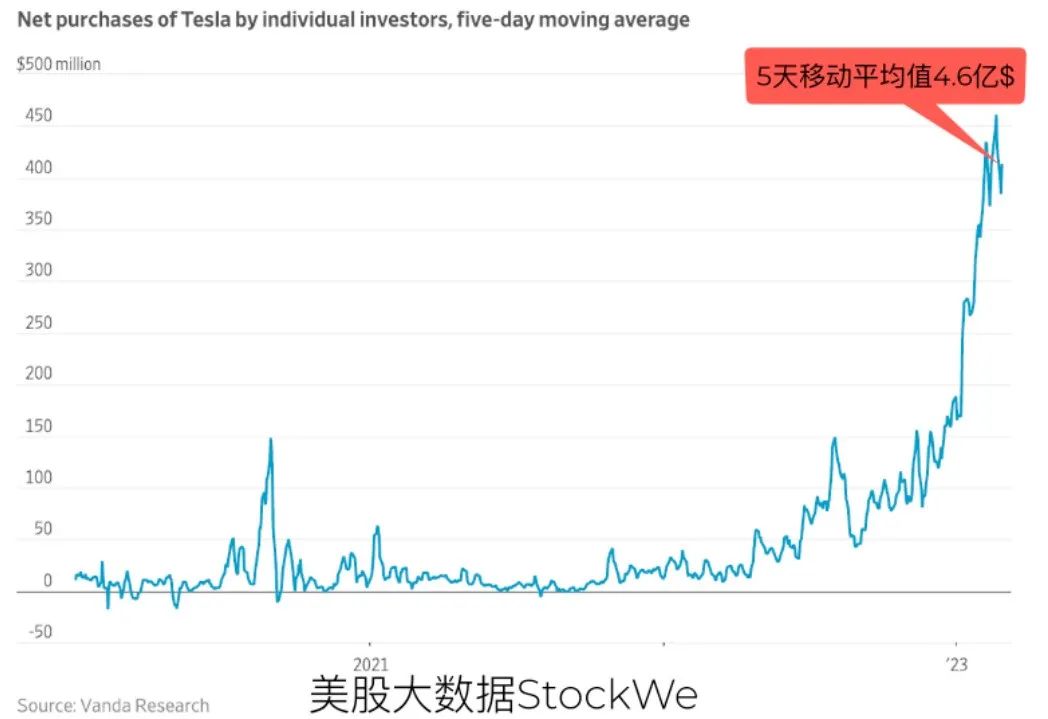 根据Vanda Research的数据,年内迄今,散户们在特斯拉股票上的净买入量已经达到了136亿美元。仅仅耗时2个多月的时间,就已经接近了去年全年近170亿美元的纪录水平。
