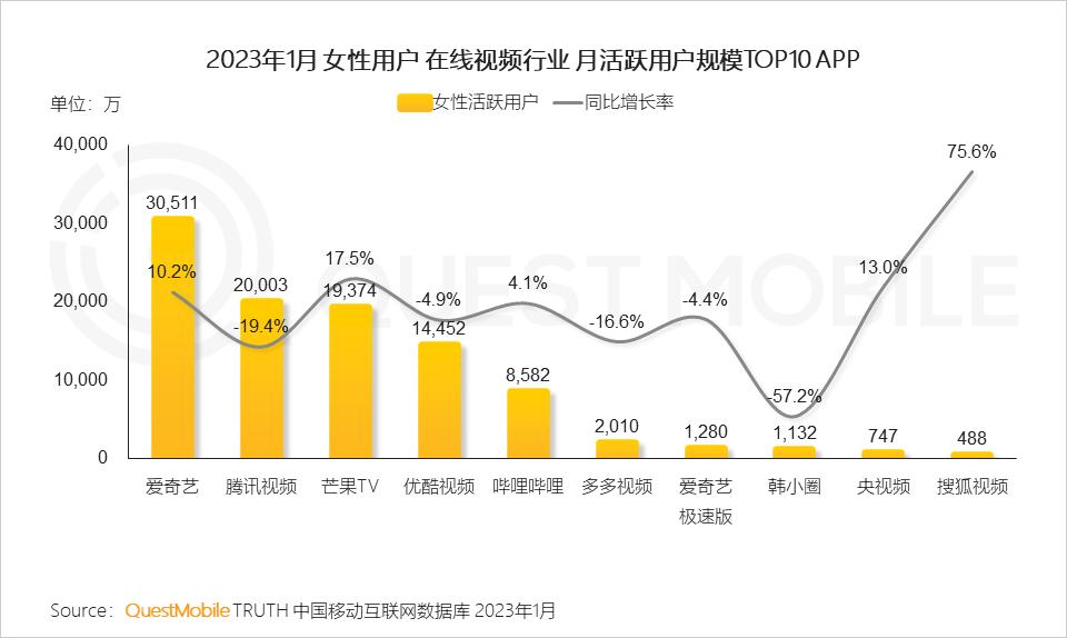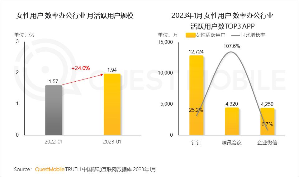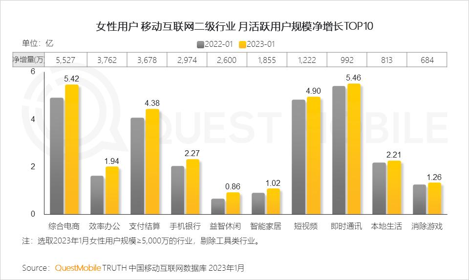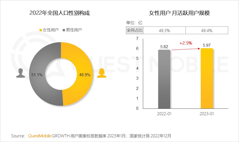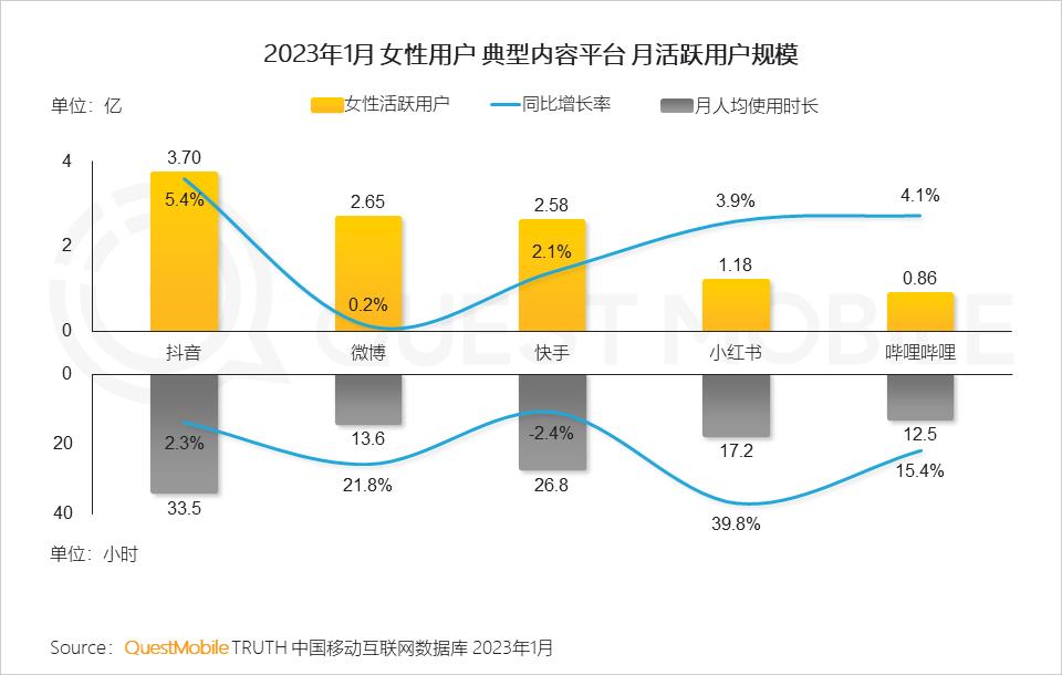 QuestMobile数据显示,2023年1月,女性用户月人均使用时长达到163.6小时,同比增长2.0%