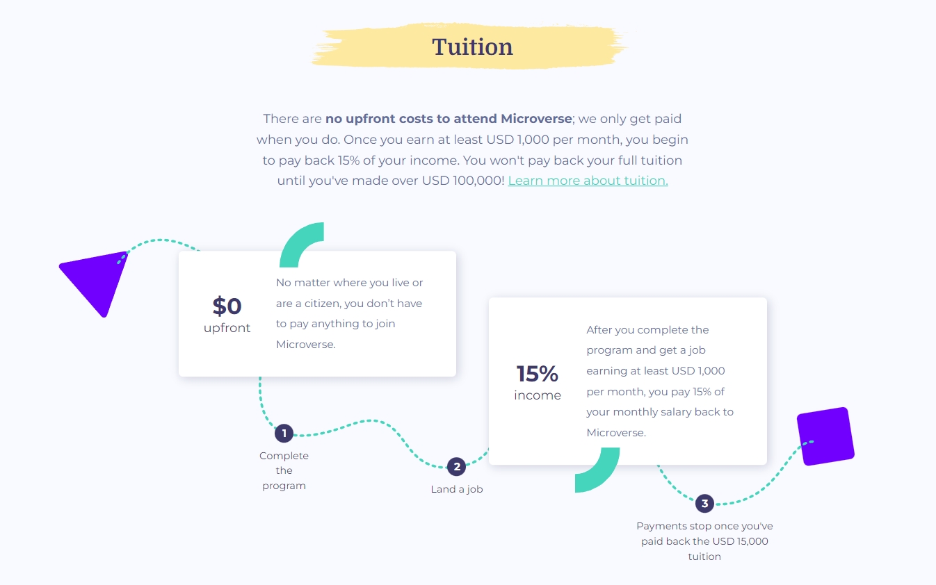 完成学习和职业训练后,如果学生找不到月薪1000美元或以上的技术工作,则他们无需支付 Microverse学费。在找到工作之前,学生不欠Microverse任何东西,没有任何的预付费用。一旦学生每月赚取至少1000美元,就需要开始偿还收入的15%。在收入超过10万美元之前,学生不会被要求偿还全部学费。一旦偿还了1.5万美元的学费,付款就会停止。