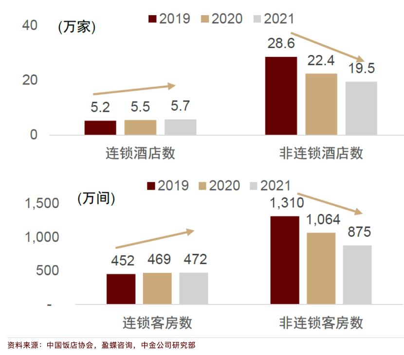 中金公司研究院也曾对酒店行业有过比较详细的研究,也提出:经过此轮单体酒店的出清与翻牌,疫情之下抗风险能力较强的头部连锁酒店集团优势凸显,行业中的抗风险能力薄弱、现金流管理较差的经济型和小房量酒店(15-69间房)大幅减少。这与我们进行餐饮业的研究结论大致相同。