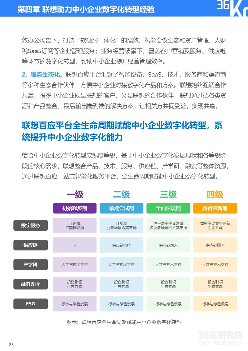 结合中小企业数字化转型成熟度等级,同时基于中小企业数字化发展现状和各等级阶段的核心需求,联想整合产品、技术、服务、方案、供应链、产学研、融资等整体资源,推出联想百应一站式智能化服务平台,全生命周期赋能中小企业数字化转型。