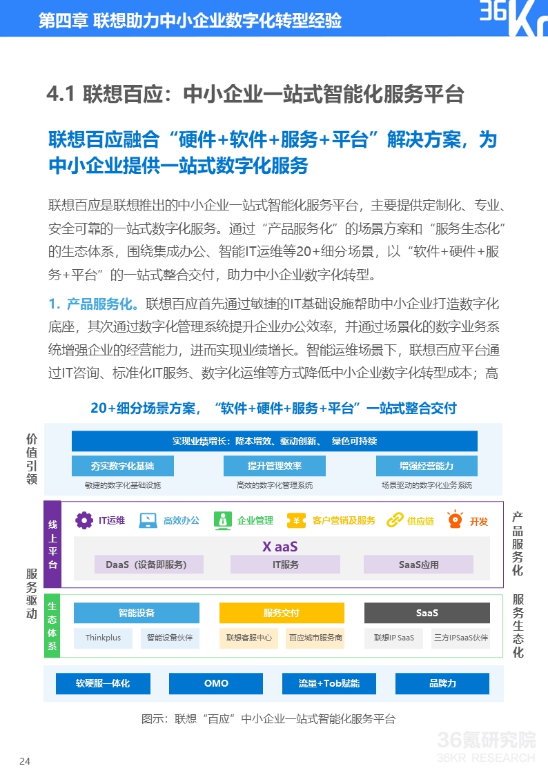 联想百应通过“产品服务化”的场景方案和“服务生态化”的生态体系,围绕集成办公、智能IT运维等20+细分场景,以“软件+硬件+服务+平台”的一站式整合交付,助力中小企业高效数字化转型。