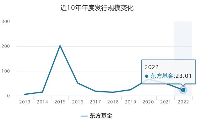 在新基金发行上,东方基金竞争力也不足。Wind 数据显示,近10年来,东方基金发新规模在不断下降。2022年东方基金发新募集规模仅23.01亿元,还不如头部基金公司一位明星基金经理募集的规模大。