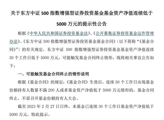 3月1日,东方基金突然发布了一则公告称,截至2023年2月27日,东方中证500指数基金已经连续30个工作日,发生基金净资产低于5000万元的情形。根据基金合同,基金净连续50个工作日出现持有人低于200人或者基金净资产低于5000万元的情形,基金将终止运作,不需要召开基金份额持有人大会。