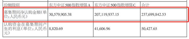 根据2022年12月20日,基金发布的成立生效公告,东方中证500指数基金分为A份额和C份额两个分级产品运作,其中,A份额募集资金仅3057.9万元,C份额募集金额达2.07亿元,两者合计刚好满足基金成立的条件,募集资金高于2亿元。