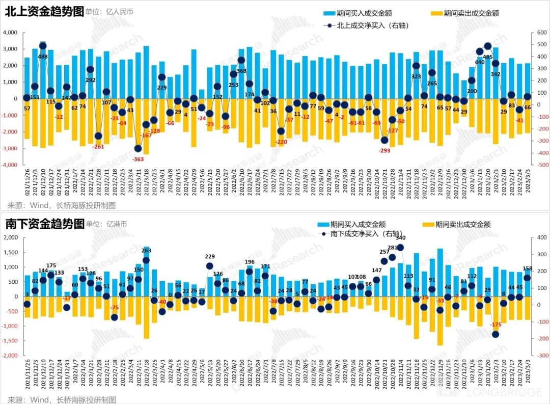 而观察北上和南下的资金,由于上周人民币汇率修复幅度并不大,港股更多是超跌之后,在国内经济复苏展望还不错的情况下,南下资金加速流入港股。北上对 A 股的买入量相对平平。