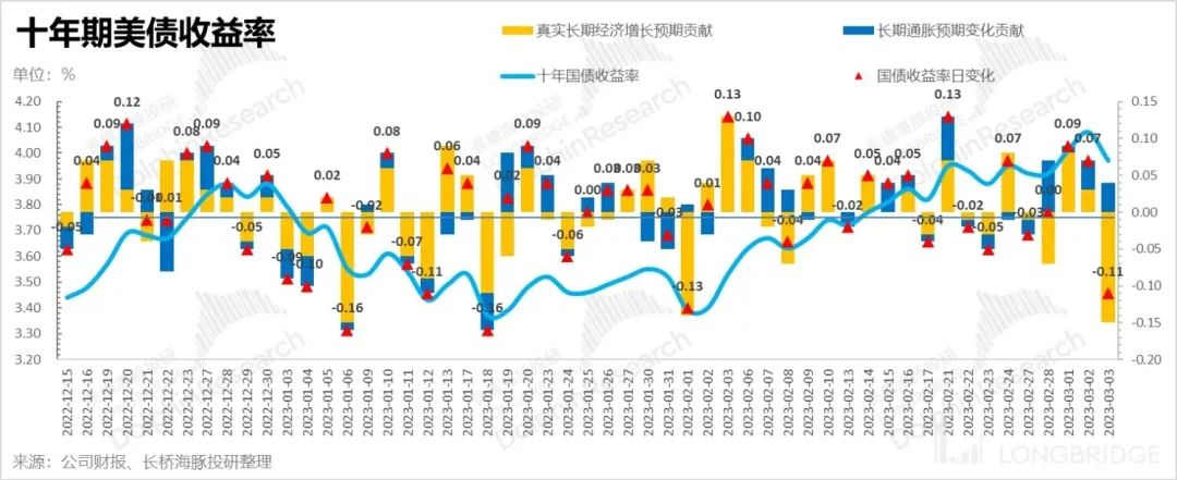 剩下的关键问题主要是高息的时间持续多久。在这个问题上,一个简单的道理是,持续时间越久,对应的是衰退预期会越高一些,因而长债回落的时候,长期真实经济增长预期先边际下行。