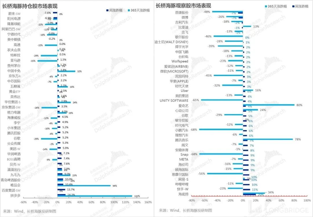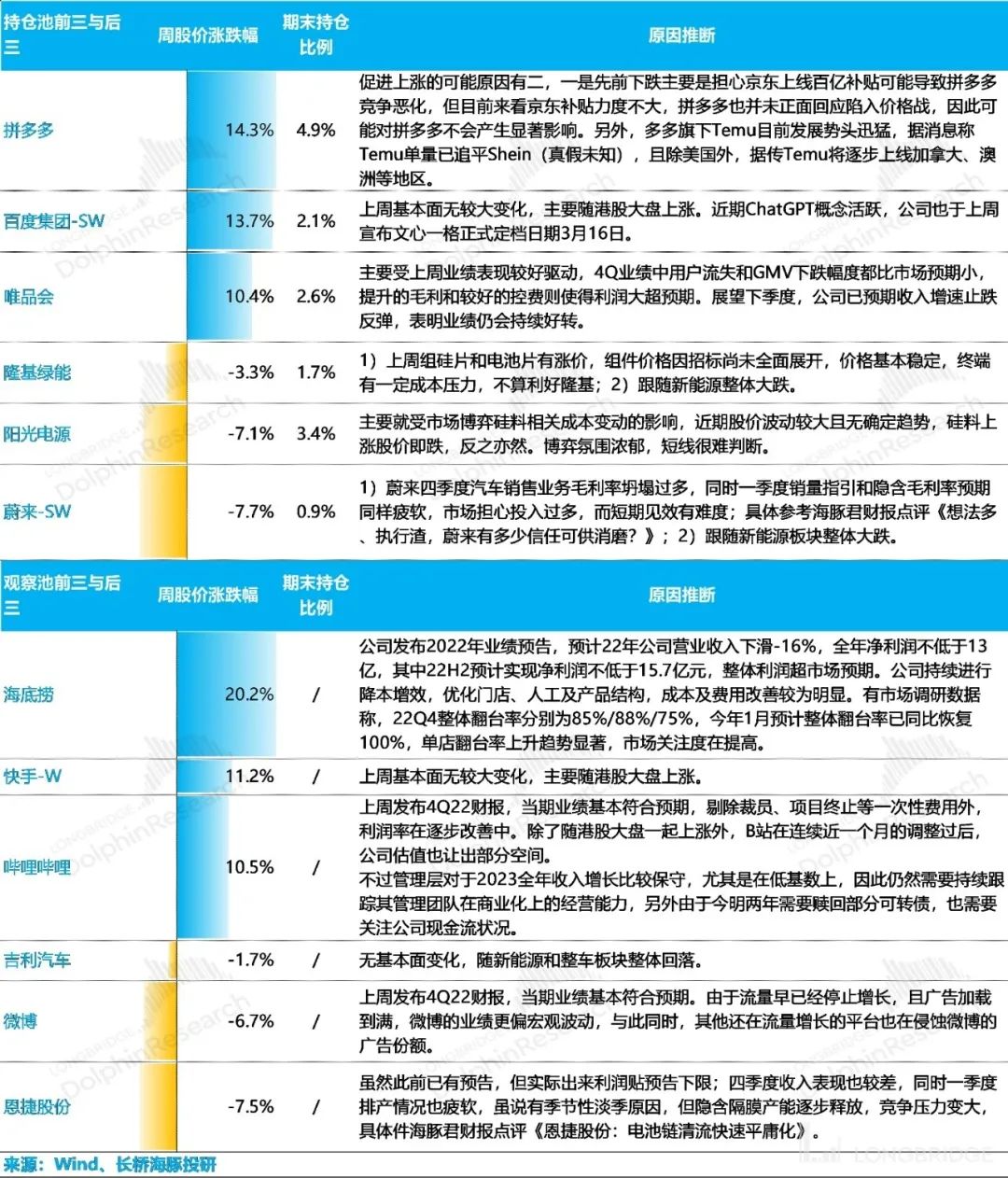 整体资产上,由于定价了过多的加息预期之后,这周整体的修复偏估值修复,整体弹性高的基本都有高成长 + 基本面改善/强劲的预期,譬如社服中的海底捞、颐海国际;拼多多、唯品会、青啤;以及快手、B 站与网易等。