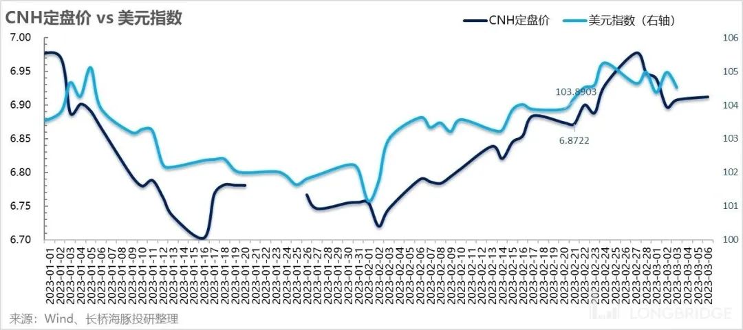 而对应货币的相对强弱上,因此美债收益率冲高回落与美元指数的冲高回落基本同步同频,人民币相对美元的强弱则保持基本稳定。