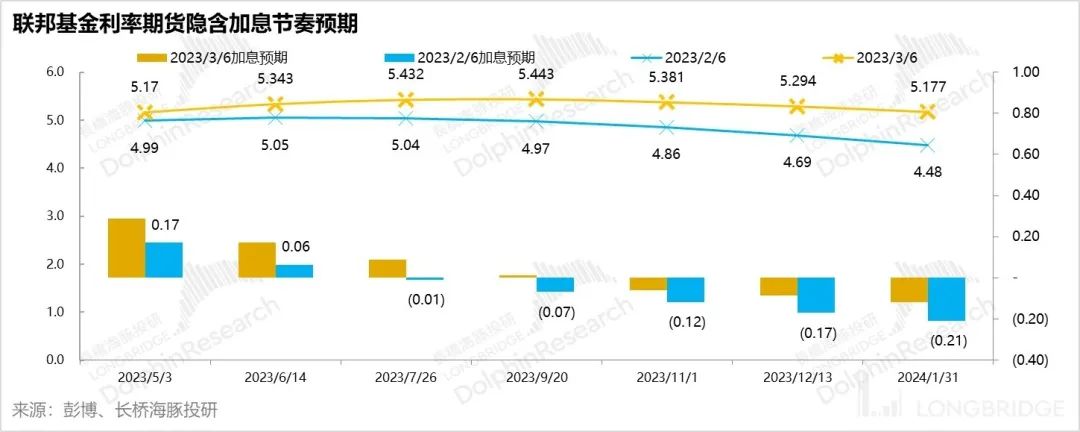 而对应短期加息预期上,美联储联邦基金利率期货隐含的加息预期,相比上次刚加息后的市场预期,由于 1 月 PCE 数据的上行,又往上拉高了接近 50 个基点,且认为高息停留的时间会更长。