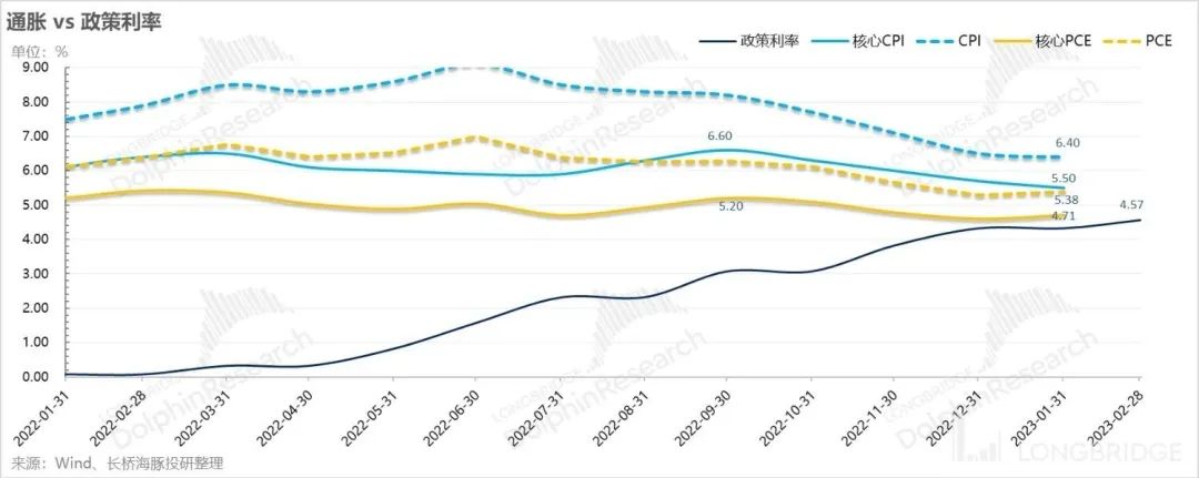 这一市场预期对应的主要通胀指标来看,除了低于目前的 CPI 之外,其他已基本全线高于市场当前其他主要通胀指标,核心 CPI,PCE 与核心 PCE 等,等于当市场把加息的顶点预期定价到 5.5% 左右的位置,已经对加息高点做了足够充分的定价。