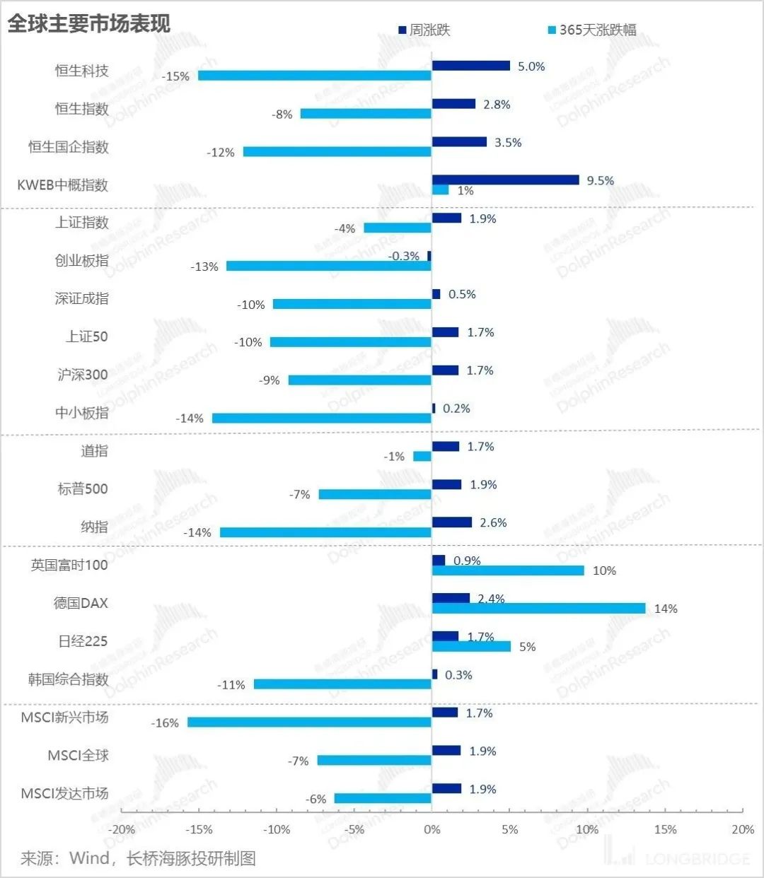 对应这些宏观数据的边际变化,市场再次演绎为加息的充分定价后的否极泰来后,全球市场开始修复,其中,港股资产又成了在宏观左右定价时刻,摆幅最大的市场,上周 KWEB 和恒生科技的涨价均在 5% 以上。
