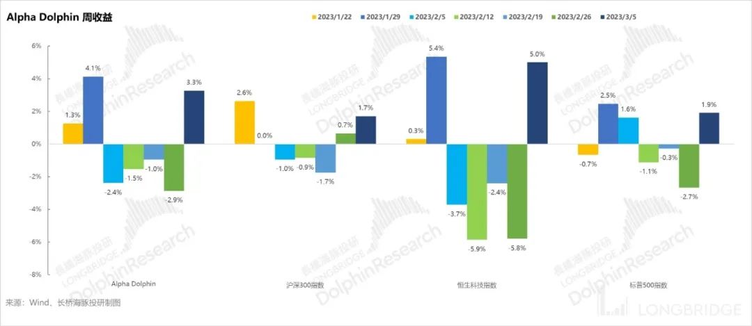 在 3 月 3 日这周内,, Alpha Dolphin 组合上行 3.5%,上行幅度明显超标普 500(1.9%)和沪深 300(1.7%),但不及恒生科技 5% 的涨幅。