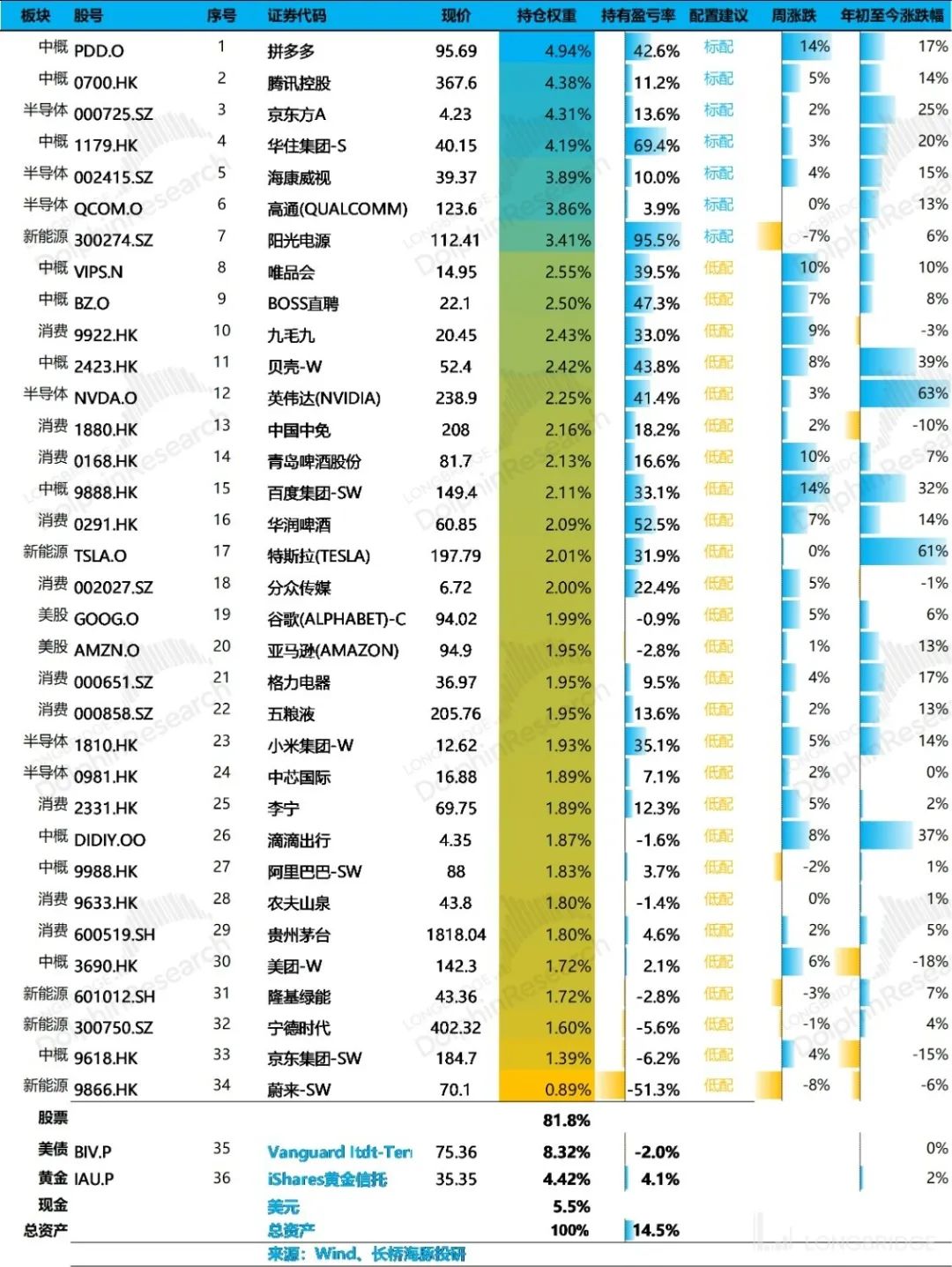 本组 Alpha Dolphin 组合无调仓,共配置了 34 只股票,其中评级为标配的 7 只,评级低配的 27 只,其余为黄金、美债和美元现金。截至上周末,Alpha Dolphin 资产配置分配和权益资产持仓权重如下: