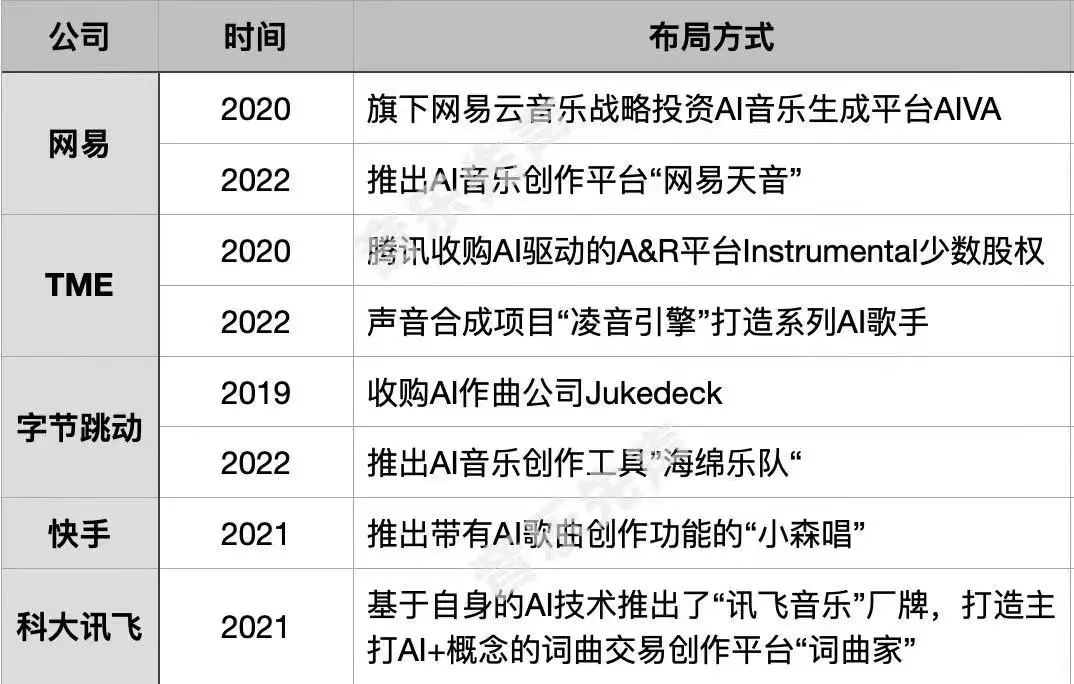 在国内,这一赛道的入局者更多。字节跳动收购了AI作曲公司Jukedeck;“唱鸭”基于华为独创的AI Singer模型,让用户只需输入歌词就能完成创作;网易还推出了网易天音,并上线“网易天音”拜年小程序,让用户输入歌词即可生成拜年歌,并用AI歌手进行演唱;快手也自主研究了AI音乐创作模型和AI歌手,并推出“小森唱”,通过AI为用户打造专属歌曲 。