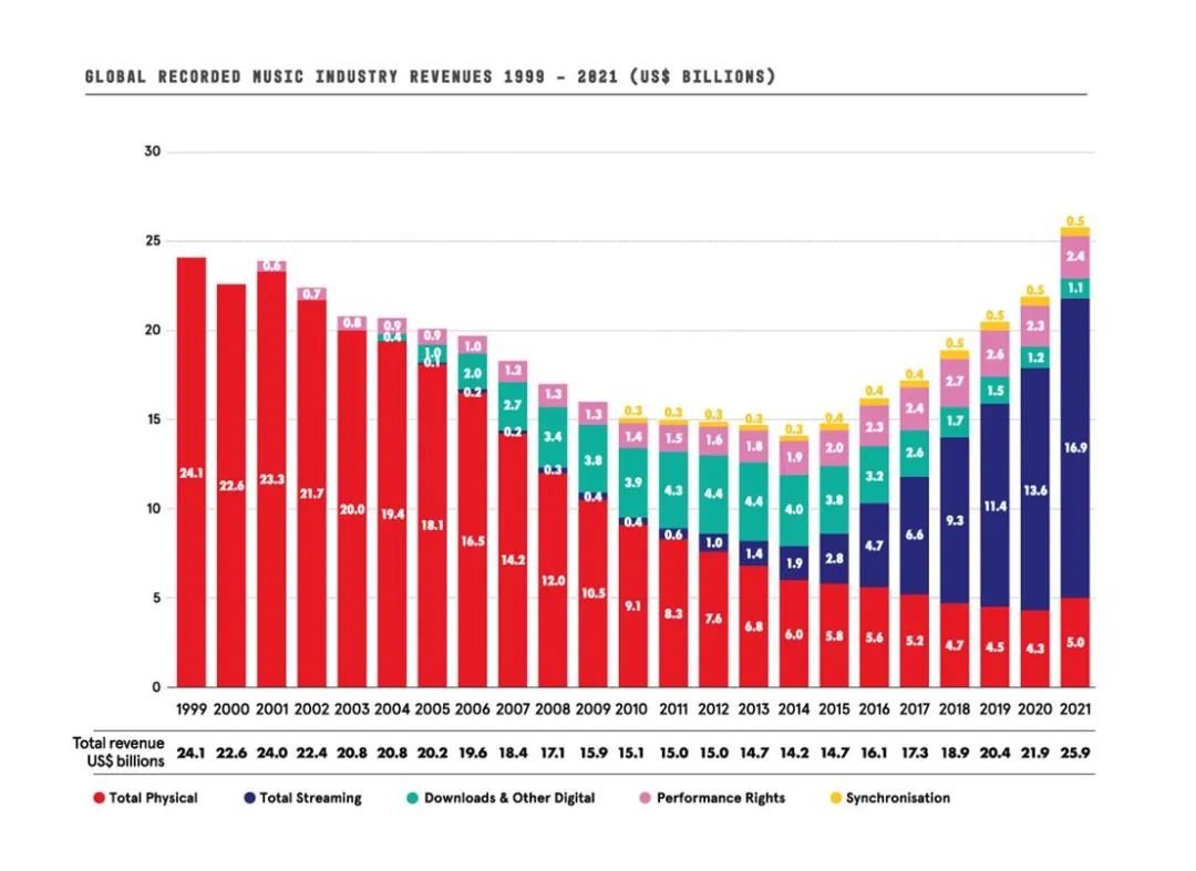 但Napster也成为了唱片公司们的噩梦。因为Napster,盗版音乐泛滥,人们能够通过互联网轻易获得音乐资源,磁带、CD和黑胶唱片的销量一落千丈,音乐行业的收入规模在之后20年都未能超过1999年的高峰,实体音乐收入更是大势已去,几乎每年都只能比去年更低。2019年,RIAA愤而起诉Napster,以Dr Dre为代表的艺人和EMI为代表的唱片公司都对其表示了强烈抗议。