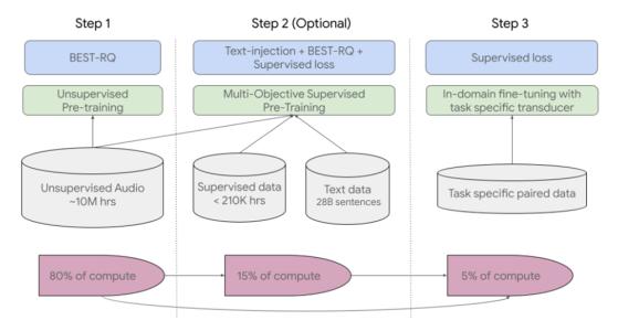 第一步是使用BEST-RQ来对涵盖数百种语种的语音音频进行自我监督学习,已经在多语言任务上展示了最先进的结果,在使用了大量的无监督音频数据后的证明结果是有效的。
