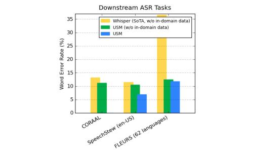 在公开可用的数据上,与Whisper相比,USM在CORAAL(非裔美国人使用的英语)、SpeechStew和FLEURS这三个语言数据集上都显示出了更低的单词容错率。