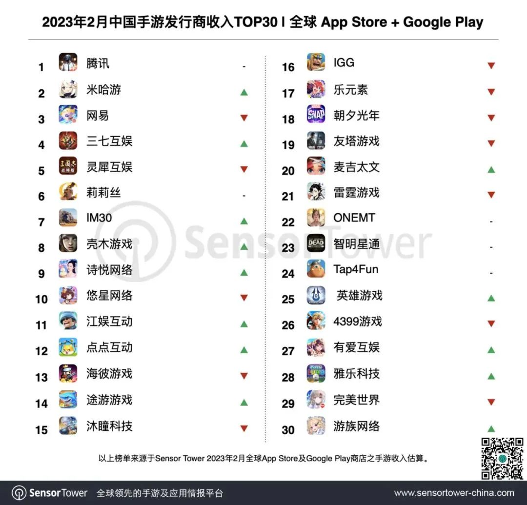 今天(3月7日),Sensor Tower发布了2023年2月中国手游发行商在全球App Store和Google Play的收入排行TOP30(以下简称厂商收入榜,仅统计发行商收入,且不包括中国地区第三方安卓渠道)。