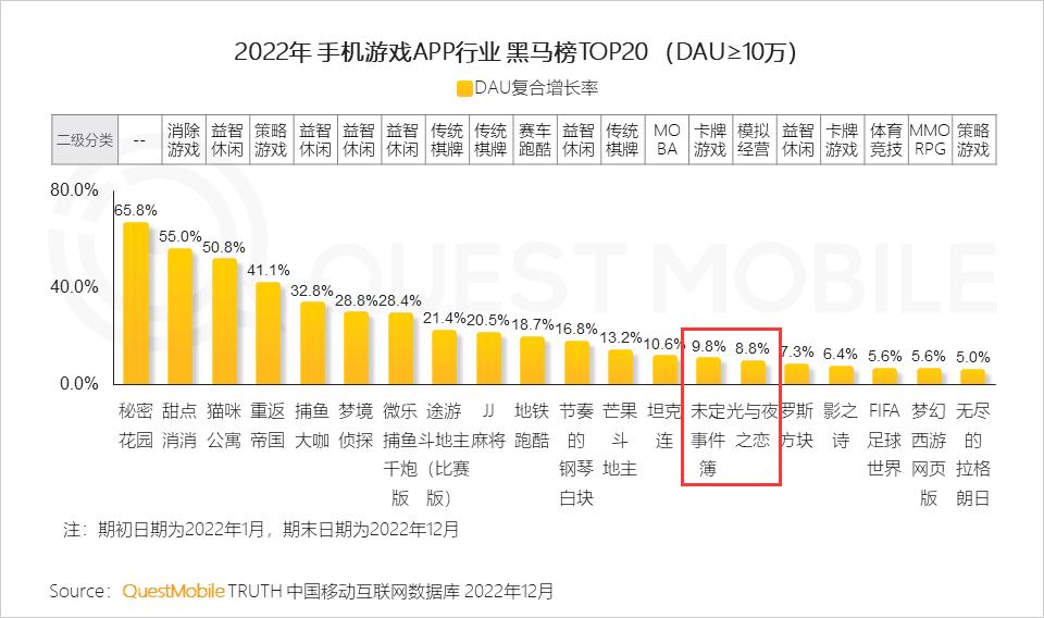 针对该现象QuestMobile发布的《2022年度报》表示:女性向游戏《未定事件簿》《光与夜之恋》在去年跻身手游黑马榜TOP20,分别位于14和15名。这也意味着女性向用户瓶颈在2022年进一步解放,而付费增长这个痛点也在今年2月有所缓解。