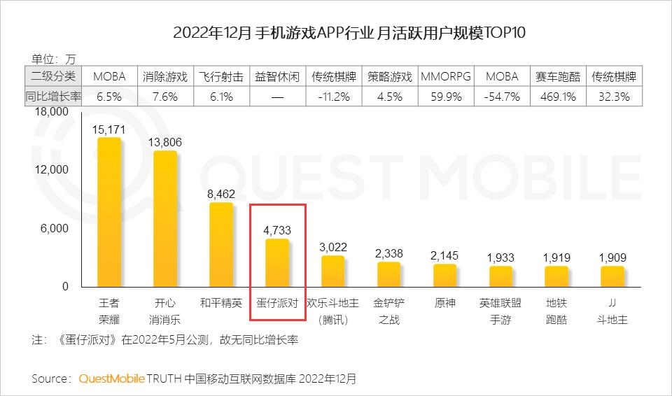 同时,根据QuestMobile发布的《2022中国移动互联网年度大报告》(下称《2022年度报》)显示,仅在2022年12月《蛋仔派对》的月活规模就成功突破4733万,成为2022年最成功的新品之一。更重要的是,《蛋仔派对》还成功搭建了派对游戏的商业模式,并且在今年年初基本稳坐iOS畅销榜前10,流水数据惊人。
