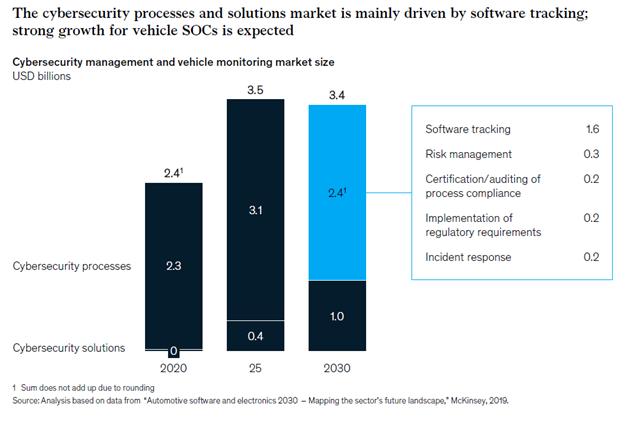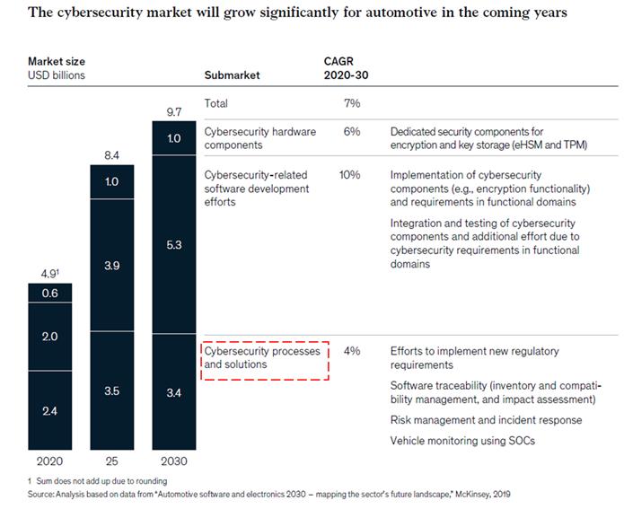 根据麦肯锡发布的《应对汽车信息安全的挑战》报告,到2030年,网络安全流程和解决方案市场的总和 (包括执行这些活动所需的人员和工具) 预计将达到34亿美元,其中网络安全流程的市场规模为24亿美元。