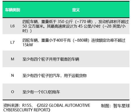 适用车型上,《要求》与R155一致,基本涵盖了乘用车和商用车的适用范围,适用于M类车型、N类车型、至少装备了一个ECU的O类车型以及具备L3级及以上自动驾驶功能的L6和L7类车型。
