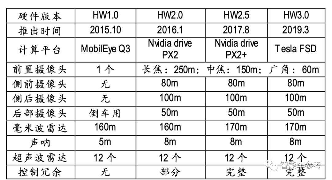 比如HW1.0时代,传感器配置为1颗前视摄像头+1个毫米波雷达+12个超声波雷达;HW2.0时代传感器数量大幅提升,使用8个摄像头+1个毫米波雷达+12个超声波雷达,这一配置也沿用到了HW3.0时代。