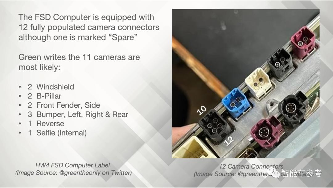 传闻称有12个摄像头接口,其中一个标注为“备用”,实际摄像头数量很可能是11个。此外,全车摄像头分布位置也有略微变动,摄像头性能有所提升——据说是支持2896x1876的更高分辨率以及540万像素。