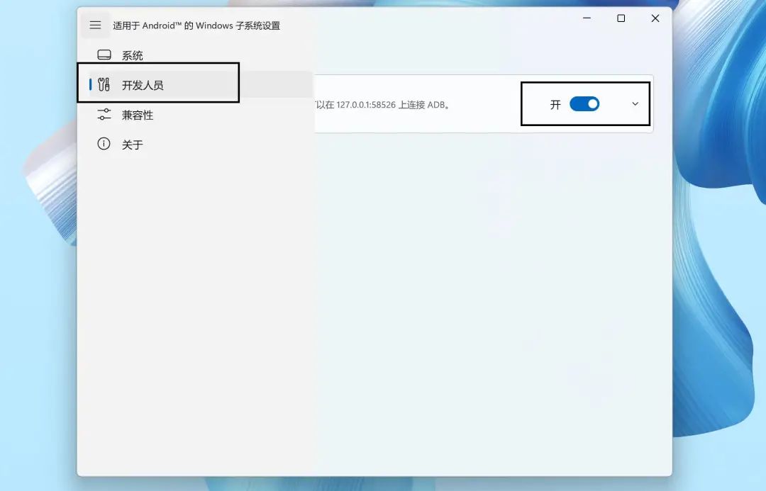 开启子系统,选择「连续」和「开发人员模式」,并开启开发人员选项,就可以安装 Android app 了。