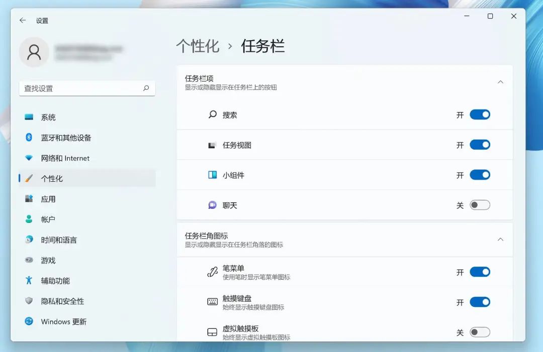 其次是小组件界面,两年半过去了,这个功能依然没有太多实际作用,如果你对股市和 Edge 推送的新闻兴趣不大,那就在「设置>个性化>任务栏>任务栏项」中把小组件关闭吧。