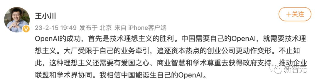 另外,还有前搜狗CEO王小川也发文隐晦地宣布,自己即将进入「中国的OpenAI」的战场,并向36氪承认自己在快速筹备中。