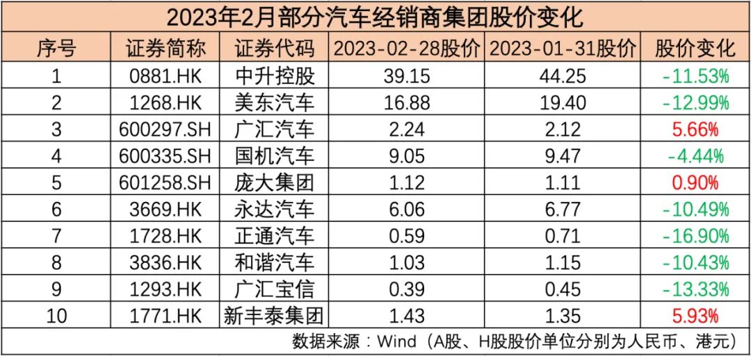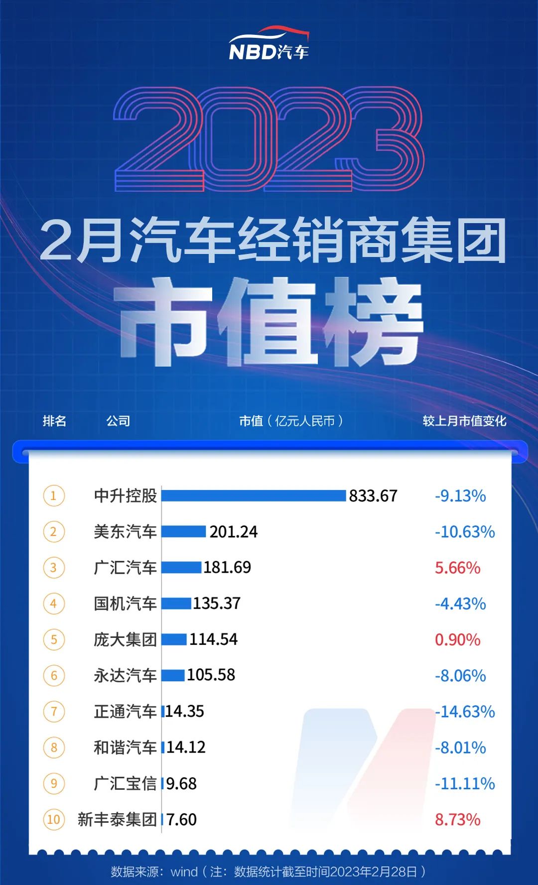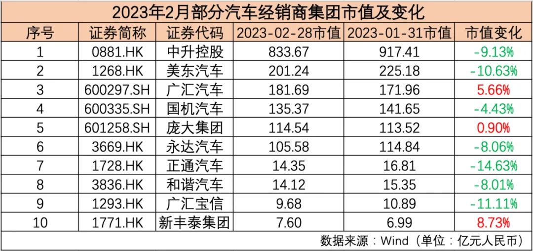 事实上,上述反应在资本市场也得到了体现。记者统计的数据显示,美东汽车(HK1268,股价20.15港元,市值270.36亿港元)、正通汽车(HK1728,股价0.6港元,市值16.47亿港元)、广汇宝信(HK1293,股价0.375港元,市值10.64亿港元)四家企业的2月市值均跌超10%;中升控股(HK0881,股价38港元,市值906.04亿港元)、永达汽车(HK03669,股价6.98港元,市值134.3亿港元)、和谐汽车(HK3836,股价1.01港元,市值15.47亿港元)的2月市值跌幅也接近10%。
